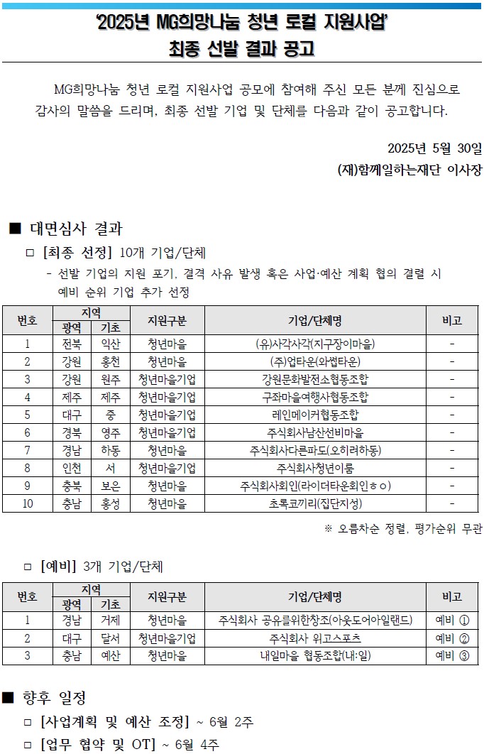 2025년 MG희망나눔 청년 로컬 지원사업 최종 선발 결과를 아래와 같이 공고합니다.