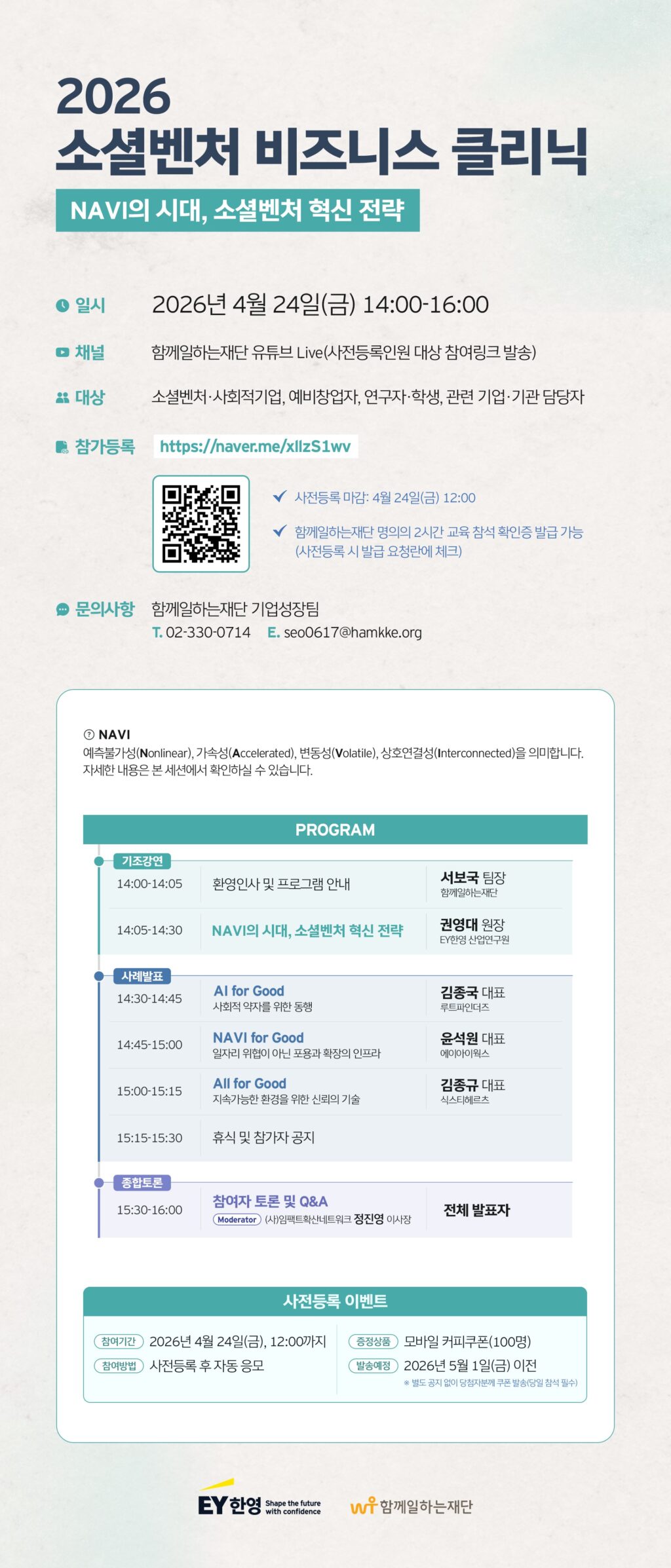 함께일하는재단은 글로벌 회계·컨설팅 법인 EY한영과 함께 변화하는 시대적 흐름 속에서 소셜벤처의 도약과 혁신 전략을 모색하고자 ‘2026 소셜벤처 비즈니스 클리닉’을 개최합니다.